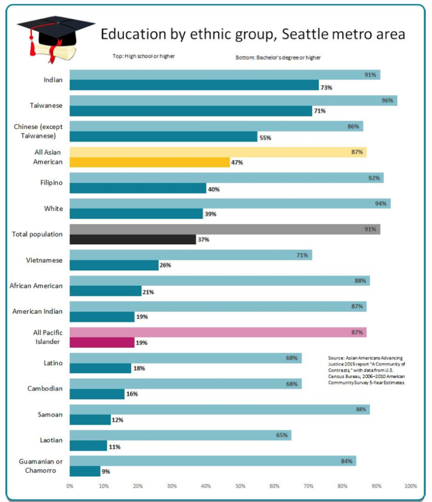 Ay Saechao speaking at South Seattle College Unite: Southeast Asian Education Summit, 2014. • Photo courtesy of SEA³eD Glancing at the data, it might be easy to assume that Asian Pacific Islanders in the state face few major hurdles in education, income, health care, or housing compared to other groups. According to aggregated data, APIs lead in educational attainment, for example: according to data from the American Community Survey, 47 percent of Asian Americans in Seattle possess at least a bachelor’s degree, a higher percentage than for whites, African Americans, and Latinos. But the way data is collected by the city and state can be misleading. While Asian Pacific Islanders in Washington comprise 25 countries of origin, they’re often treated as one category. Disaggregating the data—holding a magnifying glass to the numbers, zooming in on the sub-group level—can reveal large disparities. It can reveal entire communities who need better targeted services. Asian Americans Advancing Justice, a national nonprofit based in Washington D.C., releases an annual report on APIs in the West, including Seattle. The data is drawn from a variety of government agencies and surveys, and much of it is disaggregated. As a result, disparities in education, healthcare, and housing among Asian Pacific Islander subgroups stick out. For example: while 71 percent of Taiwanese in Seattle possess a college degree, only 9 percent of Guamians do. While 60 percent of Asians in Seattle own their homes, only 19 percent of Mongolians do. The Asian Pacific Islander community has long been calling for this disaggregation, but the issue has only recently gained wider traction. In late September 2015, Seattle became the first city to put data disaggregation into law after passing a City Council resolution to create a task force to advise on disaggregating city data.