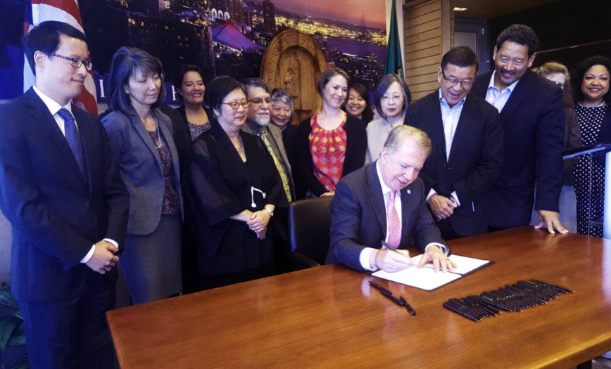 Seattle mayor Ed Murray signs a resolution on data disaggregation, making Seattle the first city in the nation to pass such legislation. The resolution was sponsored by Councilmember John Okamoto (immediately right of Murray) and co-sponsored by Councilmembers Bruce Harrel (right of Okamoto) and Tim Burgess. • Photo courtesy of John Okamoto This resolution, from Councilmember John Okamoto and co-sponsored by Councilmembers Bruce Harrell and Tim Burgess, was inspired by a Washington House of Representatives bill intended to mend disparities in education, itself sponsored by Washington State Representative Sharon Tomiko Santos. Santos’s bill hasn’t yet passed. According to Okamoto, the purpose of his resolution was to get a handle on how Seattle collects and uses data, and how this can be improved. Though the city depends on demographic data to allocate resources and come up with policies, this data is messily organized. According to Okamoto’s chief of staff Audrey Buehring, different departments collect different kinds of data from different sources, aggregated and disaggregated in various ways. Often, according to Burgess, the city doesn’t need more data—it just needs to take a proper look at it. “We have a lot of data—it’s whether or not we are analyzing the data thoroughly,” said Burgess. “There’s an obligation on the government side to make sure that we’re using the data, to make sure that we are outcome-driven.” Data disaggregation could serve many other communities besides APIs, Okamoto and Burgess agree. Seattle mayor Ed Murray points to East Africans in Seattle as an example of a group who would benefit from disaggregation by language and country of origin. The process of disaggregation, said Murray, is ongoing. “We have the initial results where we’ve started to break out the Asian American community,” Murray said. “And we need to do this not just for Asian Americans, we need to do it for all groups.” For APIs, disaggregating data challenges the stereotype that they are a “model minority”—upwardly mobile, self-sufficient and highly educated. Daniele Meñez, director of the Pacific Islander Student Commission at the UW, finds that people are often unaware of the struggles many Pacific Islander students face. According to census data, the graduation rate for Pacific Islanders who entered the UW in 2008 was 76 percent, among the lowest of any ethnic group. In her experience, Pacific Islanders are often lumped in with Asians as a model minority. Meñez said: “I have a lot of friends who are white, or who are not people of color, and they always ask me like, ‘Hey can you help me with my math homework? And math is my worst subject—I’m terrible at math. And they’re like, ‘Oh but you’re Asian, or Pacific Islander I guess, shouldn’t you be really good at math?” According to Diane Narasaki, executive director of Asian Counseling and Referral Service (ACRS), the model minority stereotype operates not just on a personal but an institutional level. It can seep into the way policy is made. “Our community has suffered from lack of prioritization from policymakers, legislators, and funders in our data driven society because of the lack of adequate disaggregated data,” she said in an email. “Without [disaggregated data], the model minority stereotype can play into decision-making.” The sheer diversity of the API community—including diversity within ethnic groups —makes any generalizations about APIs pointless, said Connie So, a lecturer in the UW’s American Ethnic Studies department. “What is a median of an Asian? It’s like talking about the median of two thirds to three quarters of the world,” she said. “Really there is no such thing as a model minority.” There are differences among Chinese groups of different national origins, said So, among Indians who are Sikh, Hindu, or Muslim, among Pacific Islanders who are Melanesians, Micronesians and Polynesians. And these are just a few examples. “The more disaggregated things are the better,” she said. The API community in Seattle is made up of over half a million people, half of them foreign born. It’s a group with a multiplicity of of national origins, religions, languages, and huge differences in immigration status, English proficiency, reason for immigration and more. All these factors and variables, said So, can contribute to the disparities—or success stories—among the different groups. “You come over as an international student, versus coming over as a refugee, versus coming over because your relatives sponsored you—you’re probably going to have pretty different experiences,” she said. When it comes to Southeast Asian struggles in education, Saechao points to the fact that most Southeast Asians came to the United States fleeing government oppression, persecution, war, or genocide, and some were already marginalized ethnic minorities within their countries. “They came to the U.S. with numerous traumas—traumas that still last today that are intergenerational,” Saechao said. “Many do not have access, due to the persecution or lack of resources to quality education back in their homeland.” Many children of these immigrants were the first in their families to attend college. Add to this the stresses of navigating a dual identity as American and a member of their ethnic group. “You have these maybe contrasting, or sometimes even conflicting, cultural expectations and roles that these students who are in our school system have to balance and maneuver and master,” said Saechao. “And with that you have educators who are not trained and don’t have the skillset to support this community.” Saechao thinks the model minority stereotype contributes to a lack of targeted services for Southeast Asians in education. Seattle’s latest resolution on data disaggregation will affect nearly a dozen departments across the city. The newly created
