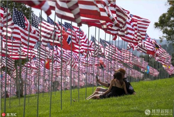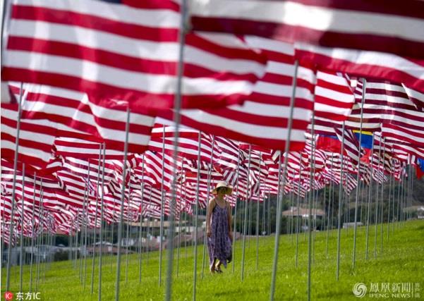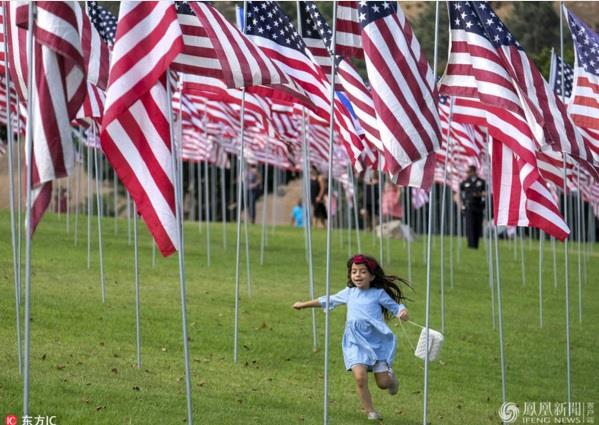 当地时间2017年9月10日,美国洛杉矶,佩珀代因大学升起3000面国旗,纪念911遇难者。来源:东方IC